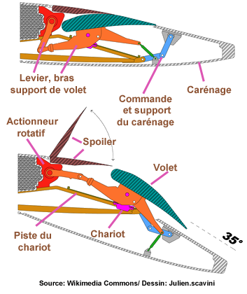 Les ailerons qui se trouvent à côté des "saumons" (caissons de formes allongés) faisant office de carénage et où sont intégré des feux de positions. (afin de pouvoir voir l'appareil même durant la nuit). Par ailleurs nous avons aussi les aérofreins qui sont des surfaces servant lors de descente rapide et après l'atterrissage. Puis les volet ou "dispositif hypersustentateur" qui rabaisse la vitesse de décrochage. C'un dispositif situé sur le bord de fuite et qui à l'avantage de pouvoir changer de forme et ses caractéristiques aérodynamiques.
