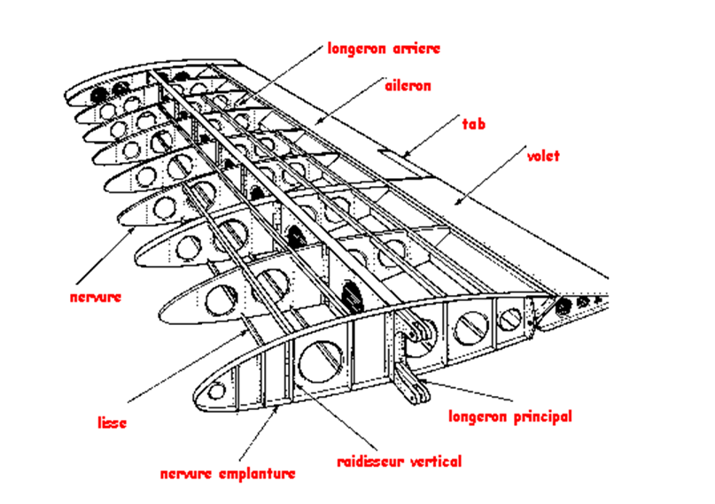 Les bord d'attaque et les bords de fuite. Pourquoi ces noms? Tout simplement car le bord d'attaque correspond à la partie avant de l'aile qui va séparer le fluide (l'air) en deux une partie qui va passer par l'extrados et l'autre partie par l'intrados (partie supérieur et inférieur de l'aile) par conséquent le bord de fuite correspond à la partie arrière de l'aile, donc là où les flux d'air s'étant séparé en deux se rejoignent. Nous avons notamment l'emplanture qui sert simplement à raccordé l'aile sur le fuselage. D'un, voire de deux longeron(s) qui prend le rôle en quelques sorte de la colonne vertébrale de l'aile. Et de nervures qui par conséquent peuvent être assimilé à ses côtes. Les longerons peuvent être monobloc ou en deux morceaux selon l'envergure de l'avion.